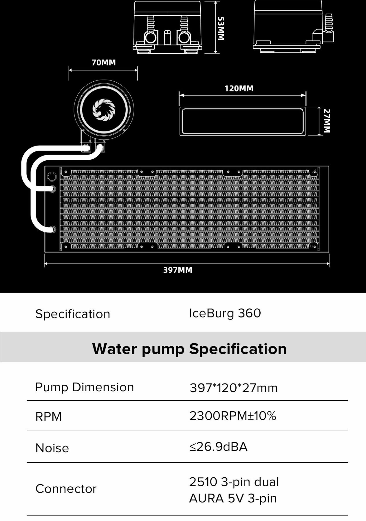 Розміри, мм::397x120x27 (радіатор), 70x83x53 (помпа)